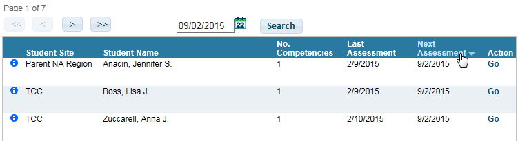 In the image below, the grid is sorted (descending) by Next Assessment. The search term box changed to a date selector, 9/2/15 was selected and the Search button was clicked. VTA Learner went to the first record it found that had a Next Assessment date of 9/2/15.