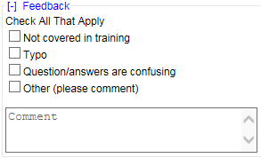 Some tests may include Feedback options. This allows you to indicate if the test question has problems that should be brought to the attention of the test administrator. An example of test feedback is shown below. Please note that your Administrator may have created different feedback options, or may have decided not to allow test feedback.